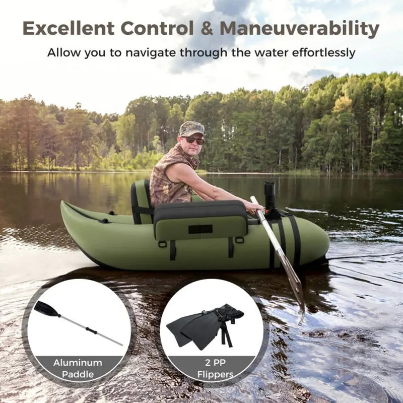 350 LBS High Weight Capacity: This inflatable fishing float tube can hold up to 350 lbs with great buoyancy design, providing you with a safe and stable fishing experience. What's more, the fishing boat is designed with Hydrodynamic hull shaped, which is perfect for tracking and steering on the lake or river when you fishing.